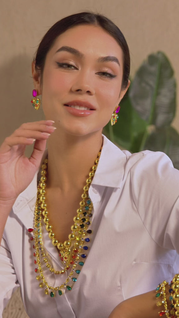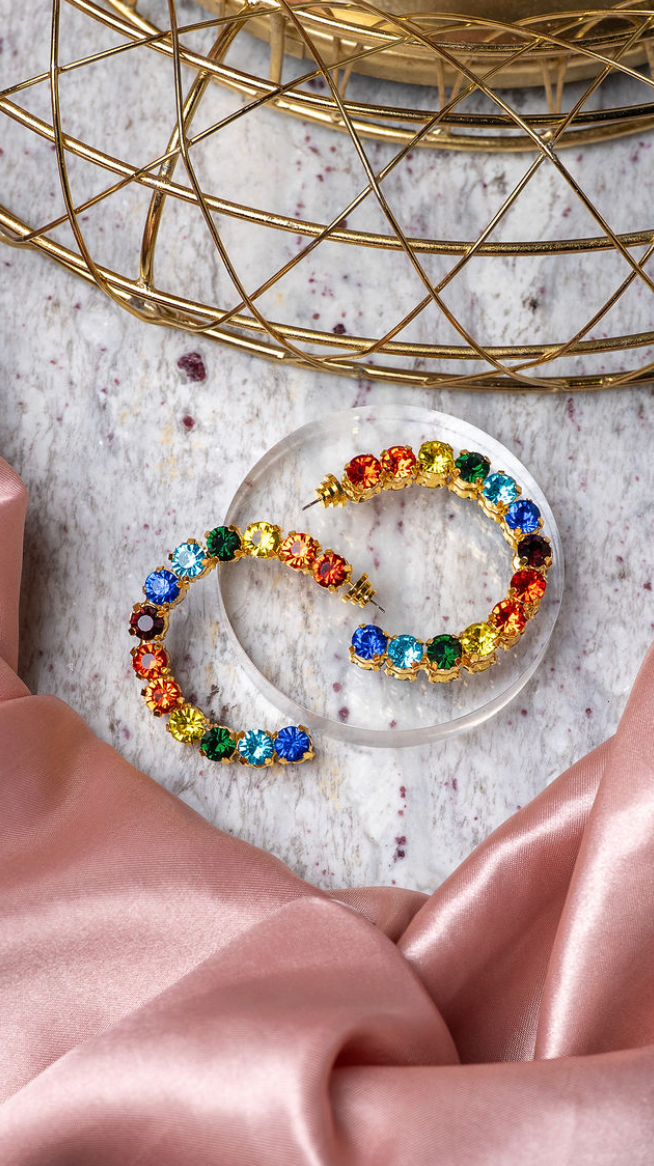 Inspired by the brilliance of a rainbow stretching across an open sky, each design reflects a spectrum of vivid hues symbolizing joy, resilience, and the confidence to be seen. Raindrop-shaped gems mirror droplets suspended in time, transformed into luminous accents that catch the light from every angle. At the center, the heart stands as a symbol of fearless love for yourself, your journey, and your becoming.