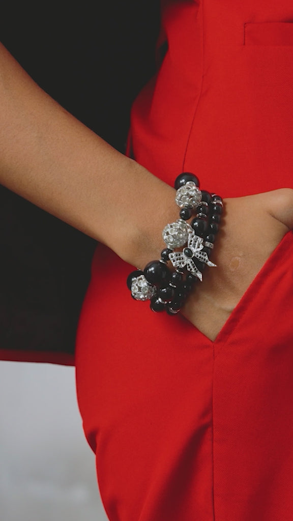 Sophistication meets effortless wear in the Diamonique Pearl Dainty 3pc Stretch Bracelet Stack – Black Pearl. This trio of glossy black beaded bracelets features dazzling pavé crystal spheres and a delicate bow charm for a touch of whimsy and grace.
