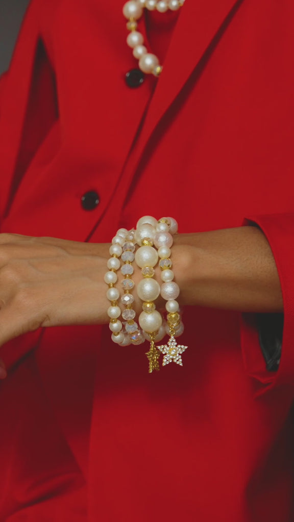 Designed with timeless allure, this radiant 4-strand pearl bracelet is where classic beauty meets a touch of stardust. Graduated white pearl beads encircle the wrist in graceful layers, while two dangling star-shaped pearl charms twinkle with every flick of the hand, creating couture with personality.