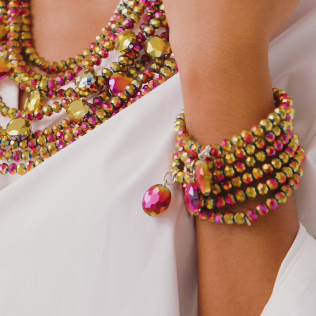 Complete your look with the Malia Glass 6pc Stretch Bracelet Stack – Rose Cherry Gold, a set of six dazzling handcrafted bracelets that capture the essence of effortless luxury. Each bracelet features luminous, faceted glass beads that shimmer with hints of rose, cherry, and gold — radiating confidence and elegance with every motion.