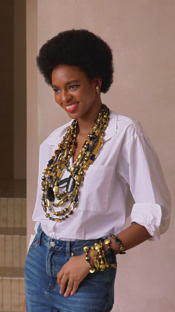 -Hand-strung beads in gold, onyx, marbled, and textured finishes