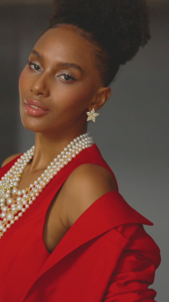 Alluring and fun, these elegant star-studded earrings are where classic beauty meets a touch of stardust. Each stud features a delicate star-shaped charm adorned with luminous sparklers that twinkle with every turn—just like a dynamic personality wrapped in luxe couture and dazzling bling.