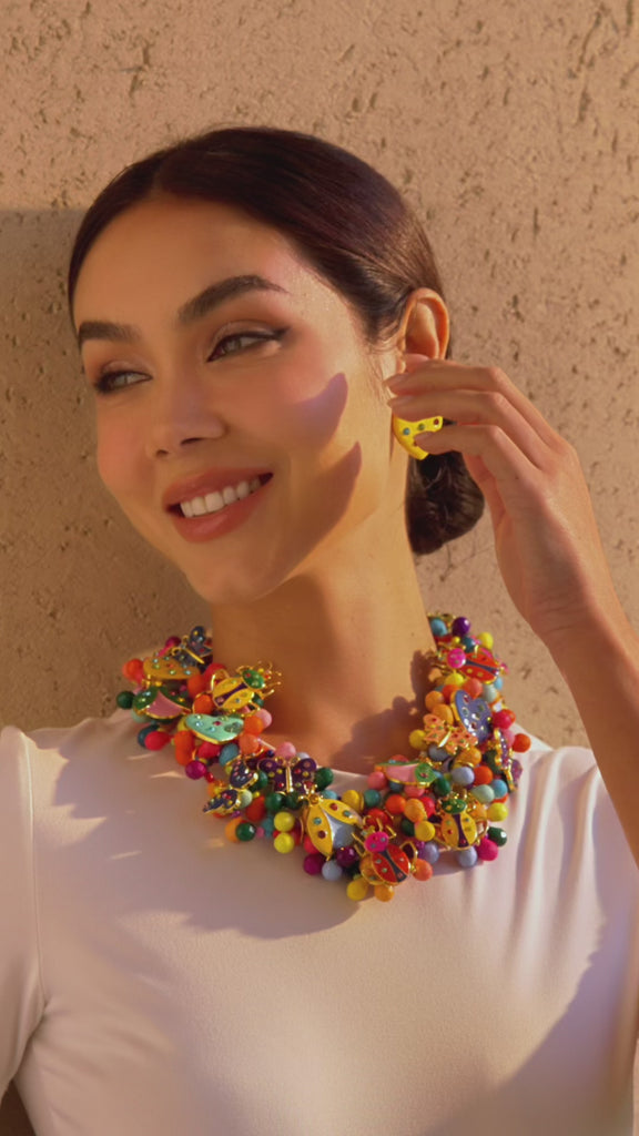 A lightweight, tiny burst of joy for your ears. The Lovebug 18k Studs in Carnivale feature playful heart silhouettes kissed with vibrant multicolor crystals, bringing a pop of happiness to even the simplest outfit. Their cheerful palette feels like confetti captured in gold.