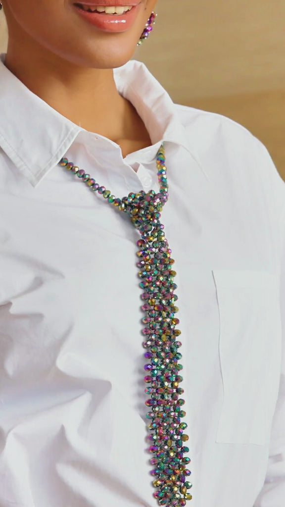 The Malia Glass Necktie – Kaleidokiss is a bonafide conversation starter. Designed to shimmer with every movement, this statement piece features faceted glass beads that catch the light in a mesmerizing kaleidoscope of color. Worn as a necktie-style necklace, it instantly elevates crisp button-downs, blazers, sweaters, and dresses with fearless sparkle.