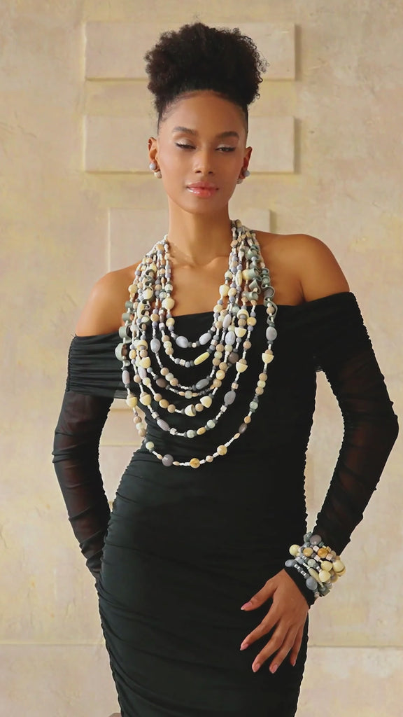 You're known as the showstopper anyway, so darling live your best life! The Caliope 2-in-1 Beaded Leather Necklace in Modern Greige is a creamy, cool-toned dream where sculpted beads, tonal stones, and hand-cut leather ribbons come together in a harmony of texture and elegance. Designed to drape effortlessly in multiple layers, Caliope gives you options: wear her long and cascading for a dramatic entrance, or detach her once for a shorter, chic silhouette. Her greige palette is the ultimate luxury subtle, serene, and stunning with everything from winter whites to jet-black evenings.