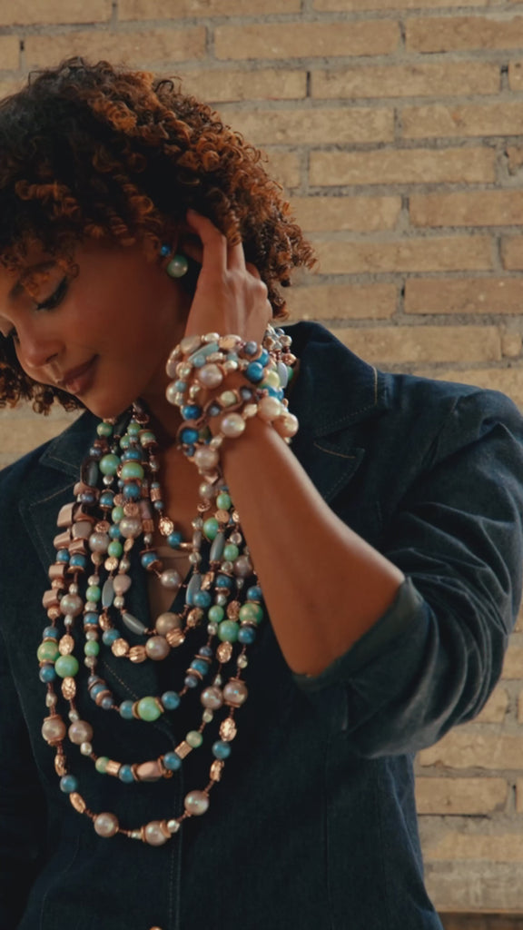 Step into understated elegance with the Caliope Twilight Rose Bracelet Stack, a 6-piece collection designed for effortless layering. Featuring luminous beads in soft pearlescent blush, deep twilight blue, and radiant rose gold, each bracelet is strung with supple leather accents that add both texture and edge. Wear them together for a bold, artful statement or style them separately for a subtle pop of sophistication. This versatile stack transitions seamlessly from casual denim days to evening polish, embodying modern femininity with a hint of intrigue.