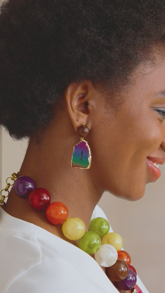 These statement earrings feature hand-cut slices of rainbow agate trimmed in radiant gold, suspended from rich chocolate-toned bead posts for the perfect balance of earthy and electric.