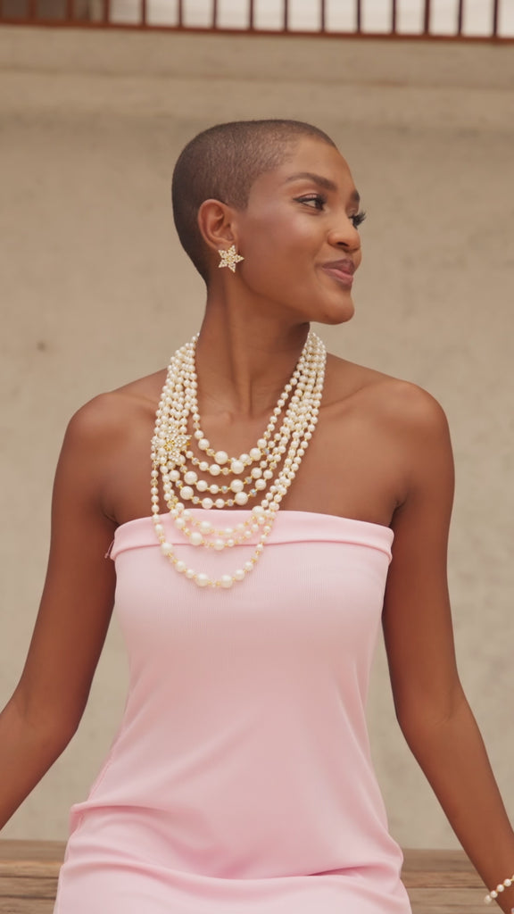 Designed with timeless allure, this radiant 4-strand pearl bracelet is where classic beauty meets a touch of stardust. Graduated white pearl beads encircle the wrist in graceful layers, while two dangling star-shaped pearl charms twinkle with every flick of the hand, creating couture with personality.