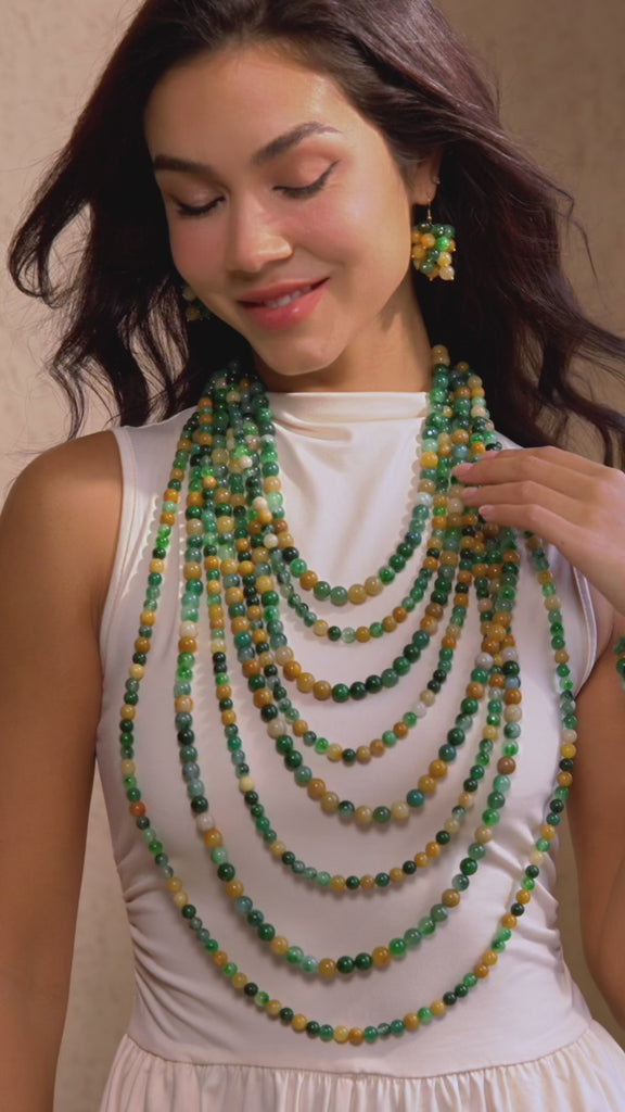 The Makemba 2-in-1 Jasper Statement Chain – Emerald Legacy is where earthy elegance meets bold versatility. Featuring cascading strands of richly hued jasper beads in deep emerald, moss, jade, and warm golden tones, this multi-layered beauty drapes the neckline in effortless drama.