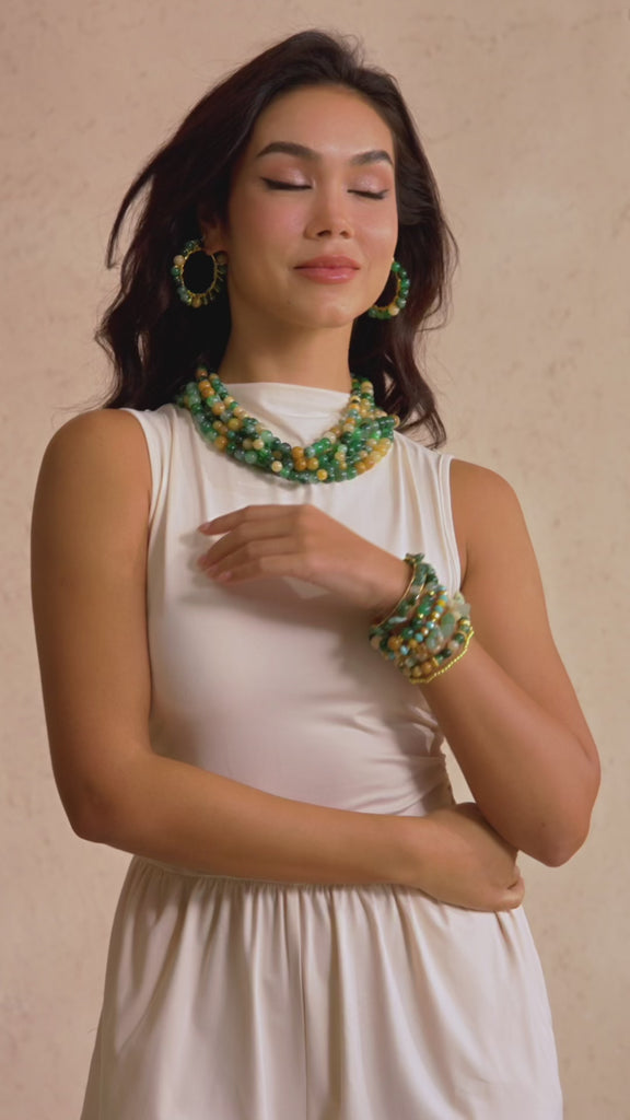 The Makemba Jasper 6pc Stretch Bracelet Stack – Emerald Legacy is a bold celebration of earthy luxury and layered glam. Featuring rich emerald greens, warm golden hues, and faceted accent beads, this six-piece stretch stack delivers effortless drama with zero effort required.